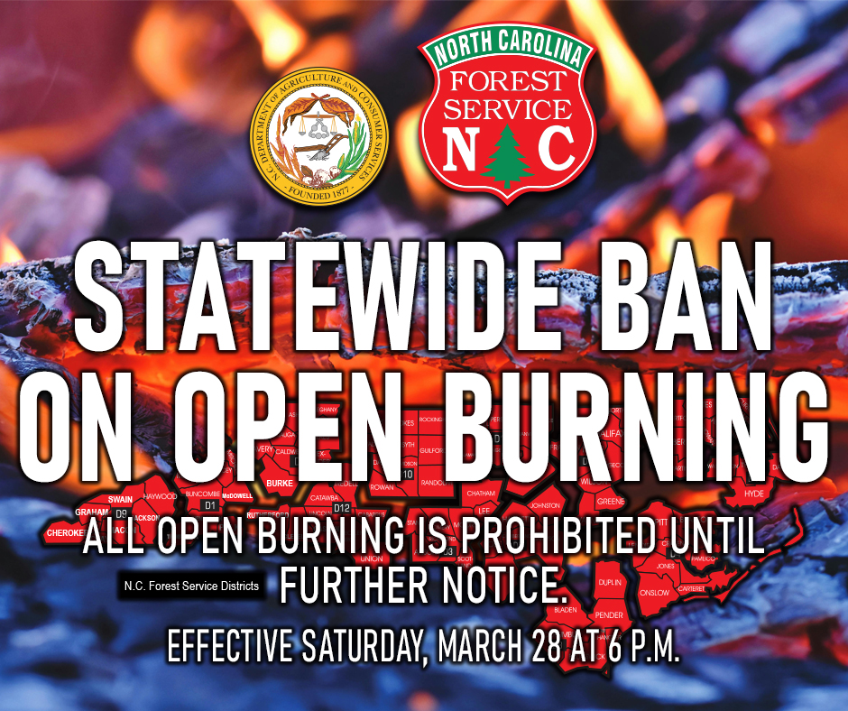 Effective Saturday, March 28, 2026, the North Carolina Forest Service has issued a statewide open burning ban due to adverse atmospheric conditions, including extreme fire danger conditions that are forecasted, including low humidity, gusty winds, and dry fuels.